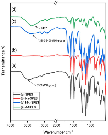 The resultant modified structures were investigated using the FT-IR technique. As presented in Figure 2, the two very broad ranges of 1570–1590 cm−1 indicate the symmetrical stretching of [C=C] from the aromatic skeleton of Na-SPES and NH4-SPES, respectively, whereas that around 1238 and 1232 cm−1 can be typically attributed to aryl oxide for Na-SPES and NH4-SPES, respectively. Strong absorption appearing at around 1148–1104 and 1145–1103 cm−1 was assigned to the stretching vibration of the aromatic sulfone (O=S=O) groups in the spectra of Na-SPES and NH4-SPES, respectively. However, the characteristic peaks of NH4-SPES of aromatic SO3- stretching vibrations observed at 1070–1010 and 1071–1011 cm−1 were assigned to the stretching vibration of the sulfonate groups in the spectrum of Na-SPES and NH4-SPES, respectively, while the ether conformational peaks appear at around 1295–1318 cm−1 for both [5,8]. Regarding the NH4-SPES spectrum, the band at 1638 cm−1 mainly refers to the deformation of asymmetric -NH4+. Peaks in the range from 2800 to 3000 cm−1 provide extra evidence for the existence of NH3+ in the desired membrane. The strong and wide absorption band above 3500 cm−1 indicates the stretching of the SO3H hydroxyl group. Similarly, the ammonium-substituted SPES spectrum displays a strong absorption peak at 3300–3400 cm−1; this could be ascribed to N-H stretching, which was absent in Na-SPES. These results are in accordance with the literature [10]. A-SPES has different adsorption peaks that can be observed at 3482–1671 and 1410–2920 cm−1. The band at 3482 cm−1 indicates the hydroxyl -OH stretching vibration from the water, and the band at 1671 cm−1 indicates the OH bending vibration connected with SPES. In contrast, the bands at 1410 and 2920 cm−1 specify the stretching vibrations of C-H bonds [28,29]. All of the remaining peaks that are the same as those of SPES are due to the introduction of amberlite-IRA-401 to SPES. All the specific observations in the FT-IR results prove that SPES was synthesized successfully without any side reactions, and it was well incorporated into Na-SPES, NH4-SPES, and A-SPES membranes.