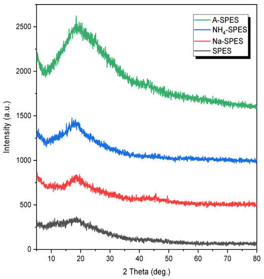 The XRD analysis for the plain SPES versus Na-SPES, NH4-SPES, and A-SPES is illustrated in Figure 4.