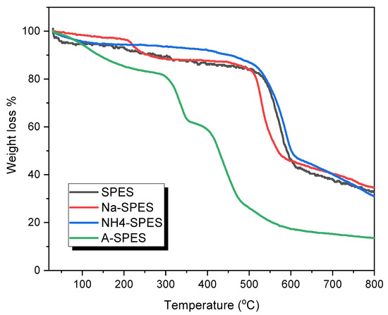 TGA analysis was performed to assess the degree of alteration and to investigate the thermal stability of the ion-exchange membranes that were produced. The thermal stability test of the ion-exchange membranes was carried out starting from a normal temperature to 800 °C. The heating conditions were selected as 10 °C min−1 heating rate under a steady nitrogen atmosphere (Figure 5). In addition, Table 1 displays the temperatures (°C) for various percentages of decompositions from 10 to 50%, which are attributed to the weight losses from 10 to 50% degradation, respectively [30,31]. As observed in the figure, the TGA curves of SPES, Na-SPES, NH4-SPES, and A-SPES display a slight weight loss in the range of 3–5%, which almost stops before 160 °C as a result of the solvation process and/or the extraction of the attached adsorbed water. The temperatures for 5% weight loss represent the polymers’ decomposition temperatures (PDTs) [31,32].