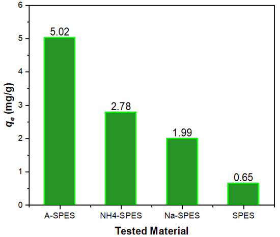 where Co and Ce display the starting and definitive concentrations before and after filtration with the used material, respectively; the volume is presented as V (mL); and the adsorbent weight is presented as M (in g). Table 2 displays the values of the distribution coefficients for all of the metal ions involved in this research. As a result of the selectivity of the SPES membranes against Co(II), A-SPES was shown to be the most selective material against Co(II) ions among the SPES membranes evaluated. For the studied products, the order of increasing Co(II) ions is as follows: A-SPES > NH4-SPES > Na-SPES > SPES. Figure 6 depicts this arrangement.