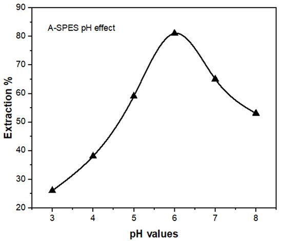 The presence of H+ ions in a solution influences the adsorbed species and ionization degree, as well as metal ion detection in an aquatic environment by adsorption [38]. The impact of pH on Co(II) adsorption via the newly synthesized A-SPES compound was studied as a result. The impact of pH was investigated by altering the pH solution limit from 3.0 to 8.0 with matching buffer solutions, using a Co(II) concentration of 5 mg/L. Each standard solution was prepared separately with 30 mg of A-SPES. The influence of pH on the percentage of extraction is shown in Figure 8; pH has an immediate impact on the process of removal. The tests were carried out with 30 mg of A-SPES at 25 °C and the pH limit in the range from 3.0 to 8.0. With a rising pH value, the extraction percent of Co(II) notably rises, followed by a drop, as seen in Figure 6. The largest percentage of extraction of Co(II) (81%) occurs at pH 6.0, indicating that the A-SPES compound represents the highest selectivity for Co(II) at this pH level.