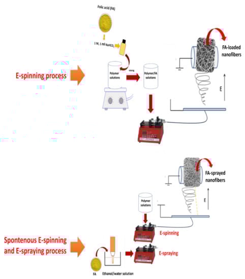 The simultaneous process (electrospinning + e-spraying process) has been detailed in a previous study []. Two syringe pumps for polymer solution and FA dispersion were utilized in the experiments. The environmental factors and the speed of the collector were the same as in blending electrospinning process. Schematic illustrations of the two distinct processes are shown in Figure 1. In the simultaneous process, all polymer solutions were prepared. Afterwards, the sonicated FA–ethanol solution and the polymer solutions were transferred into two distinct plastic syringes. These solutions were fed into the system by two distinct syringe pumps as in the electrospinning process.