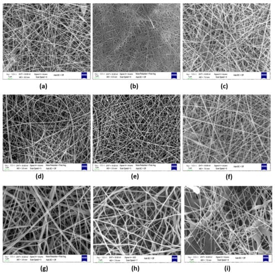 (a) SEM image of PVA-Gel, (b) PVA-Gel/FA, (c) PVA-Gel/sFA, (d) PVA-CHi, (e) PVA-CHi/FA, (f)PVA-CHi/sFA, (g) PVA-Alg, (h) PVA-Alg/FA, and (i) PVA-Alg/sFA nanofibers (Magnification: 5 kX, scale bar: 1 µm).