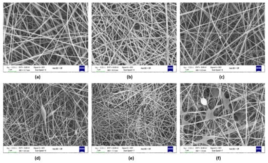 (a) SEM image of PVA-Gel–CHi, (b) PVA-Gel–CHi/FA, (c) PVA-Gel–CHi/sFA, (d) PVA-Alg–CHi, (e) PVA-Alg–CHi/FA, and (f) PVA-Alg–CHi/sFA nanofibers (Magnification: 10 kX, scale bar: 1 µm).