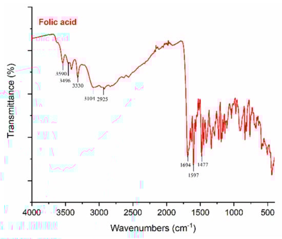 The peaks at 3590 cm−1, 3496 cm−1, and 3330 cm−1 are linked with the (–OH) groups of folic acid in the crystalline structure. Moreover, the characteristic peaks of folic acid in the broad band between 3101 and 2400 cm−1 are caused by (–OH) groups of glutamic acid []. It has been found that the –NH stretching peak in the structure of the pterin ring disappeared in the broad band; however, the peak can be seen at 3101 cm−1 []. The (–C=O) group, related to pterin structure, can be observed at around 1694 cm−1 []. The peaks at 1635 cm−1 ((–C=N) stretching) and 1597 cm−1 belong to the bending of (–CONH2) [], and 1477 cm−1 is related to the (–C=C) stretching of phenyl and pterin rings.