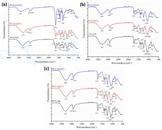FT-IR spectra of binary nanofibers, (a) shows comparison of PVA-Gel/sFA, PVA-Gel/FA, and PVA-Gel, (b) shows spectra of PVA-Chi/sFA, PVA-Chi/FA, and PVA-Chi, and (c) shows spectra of PVA-Alg/sFA, PVA-Alg/FA, and PVA-Alg.