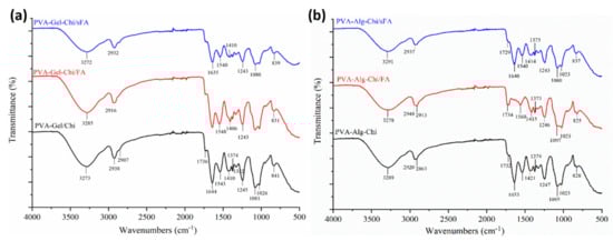 FT-IR spectra of ternary nanofibers (a) shows comparison of PVA-Alg/sFA, PVA-Alg/FA, and PVA-Alg, (a) shows spectra of PVA-Gel-Chi/sFA, PVA-Gel-Chi/FA, and PVA-Gel-Chi, and (b) shows spectra of PVA-Alg-Chi/sFA, PVA-Alg-Chi/FA, and PVA-Alg-Chi.