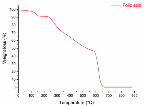 Figure 7 shows the thermogram of folic acid, which reveals that the bioactive powder was decomposed into four stages. In the first stage, the weight-loss of 7.54% was caused by removing moisture at temperatures from 100 to 170 °C. The 2.34% weight-loss in the second stage is related to the degradation of glutamic acid in the FA structure (between 170 and 240 °C) []. A slower degradation behavior occurred in the 240–600 °C range, with a weight-loss of about 49%. This was due to the degradation of the functional groups, which are pterin and p-amino benzoic acid (Janković, 2010). In the last stage, the 41.3% weight-loss was connected to the decomposition of pyrolysis products formed in the second and third steps.