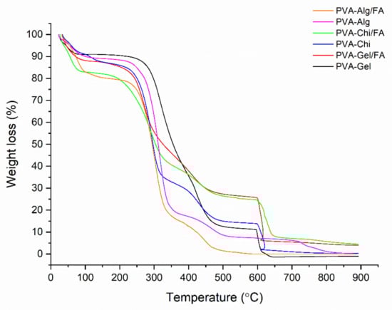 TGA was used to assess the thermal stability of the nanofibers (Figure 8). Three main stages are seen in the TGA curves, which are linked to solvent and humidity being trapped inside (30–110 °C) the nanofiber samples; the second stage is connected to degradation of the polymers between 280 °C and 450 °C and the third stage is due to the degradation of the pyrolysis products of the polymers, which are formed during the polymer degradation stage under a N2 atmosphere [,]. The second weight-loss phase, related to the decomposition of the polymers, was composed of two steps according to the binary polymer mixture. The decomposition curves of PVA-Gel, PVA-Alg and PVA-CHi suggest two different decomposition behaviors. The first decomposition was related to the removal of the side group from the macromolecule chain. The last was related to the main macromolecule chain scission. Except for PVA-Alg/FA and PVA-Alg/FA, all samples gave pyrolysis products due to the inert atmosphere (N2 condition). After changing the atmosphere from N2 to O2 at 600 °C, all samples lost mass, except PVA-Alg/FA and PVA-Alg/FA, resulting from the alginate decomposition behavior in the inert atmosphere. Alginate does not create pyrolysis products when it decomposes under inert condition [].