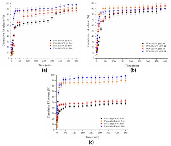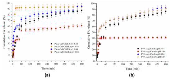 The release behaviors of PVA-CHi/FA samples were the same in both acidic and alkaline medium (Figure 9b). After 180 min, the FA release rate increased in alkaline medium, and therefore the samples showed the highest quantity of released FA at the end of the release study. The amount released in acidic medium remained at almost 90%. Until 90 min, the release behavior of PVA-CHi/sFA was different from that of PVA-CHi/FA. A higher FA release rate occurred in the acidic medium (around 93%), while a lower FA release rate was observed in alkaline medium (around 85%).