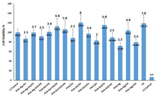 The PVA-Gel/FA, PVA-CHi/FA, and PVA-Alg/FA samples acheved cell viability values of 115.4 ± 13.1, 120.6 ± 16.4, and 104.2 ± 17, respectively. PVA-CHi/FA fibers had the highest cell viability value of 120.6 ± 16.4.
