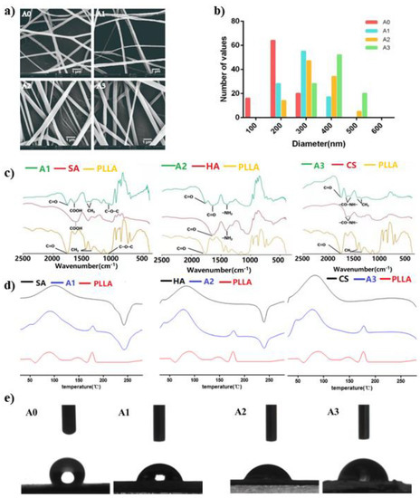 Physical and chemical properties investigation ((a,b) SEM of electrospinning fibers and diameter distribution; (c) Fourier transform infrared (FT-IR) of fiber scaffold; (d) DSC of fiber scaffold; (e) Experimental results of contact angles of spinning stent) (A0 6% PLLA; A1 1% sodium alginate (shell)—6% PLLA (core); A2 1% sodium hyaluronate (shell)—6% PLLA (core); A3 1% chitosan (shell)—6% PLLA (core)).
