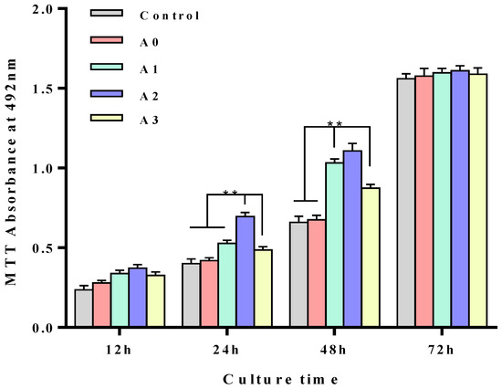Cell viability of the different coaxial scaffolds. (Control) with no scaffold, (A0) 6% PLLA, (A1) 1% sodium alginate (shell)–6% PLLA (core), (A2) 1% sodium hyaluronate (shell)–6% PLLA (core), (A3) 1% chitosan (shell)–6% PLLA (core). * indicates p < 0.05, ** indicates p < 0.01.