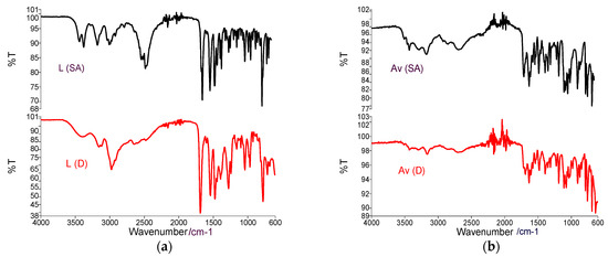 (a) FTIR spectra of Lidocaine L (SA))/Lidocaine dissolved L (D); (b) FTIR spectra of Acyclovir Av (SA) and Acyclovir Av (D).