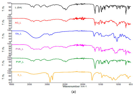 To identify possible interactions between the reactants and active substances proposed for patch preparation, we decide to prepare a binary mixture between each component and the active substances. The binary mixtures were obtained by mechanical mixing of the components in a mass ratio of 1:1. These mixtures were analyzed by FTIR spectroscopy and thermal analysis and the results were compared with the results obtained by the same techniques in the case of the active substances L (SA) (Figure 3a) and Av (SA) (Figure 3b).