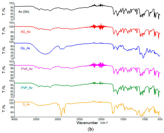 The FTIR spectra of membranes based on alginate, PVP, and Span (Figure 4d), highlight the characteristic peaks of active substances much more clearly [36]. It seems that in this membrane variant, Span does not show interactions with L (or Av). This highlighting of the active substance groups is because, for this membrane, the amount of gelling agent is smaller than in the studies performed on binary mixtures. Otherwise, we can conclude that in this type of preparation, the characteristic groups for Span are blocked by polymerization.