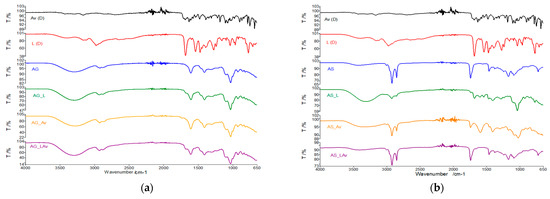 Analyzing the overlapping curves of Av and L with the membranes’ spectra based on alginate and glycerol (Figure 4a), we can say that both individual and mixed membranes with lidocaine and acyclovir present the representative peaks of acyclovir, but these are easily visible in the FTIR spectrum of membranes. Here, it is essential to mention that the characteristic bands of the membranes partially cover the distinctive bands of the active substances.