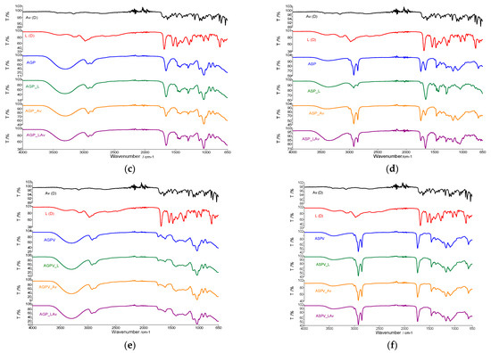 (a) Comparative FTIR spectra of Av and L with the membranes spectra based on alginate and Glycerol; (b) Comparative FTIR spectra of Av and L with the membranes spectra based on alginate and Span; (c) Comparative FTIR spectra of Av and L with the membranes spectra based on alginate, Gly and PVP; (d) Comparative FTIR spectra of Av and L with the membranes spectra based on alginate, Span and PVP; (e) Comparative FTIR spectra of Av and L with the membranes spectra based on alginate, Gly and PVA; (f) Comparative FTIR spectra of Av and L with the membranes spectra based on alginate, Span and PVA.