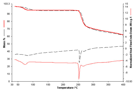Literature proves that thermal analysis techniques are methods used in the physico-chemical characterization of various materials used in the pharmaceutical industry. Thermal analysis techniques such as differential scanning calorimetry (DSC), differential thermal analysis (DTA), and Thermogravimetry (TG) are widely used in studies of pre-formulation, drugs, and substance development of pharmaceutical interest [26,27]. Thermal analysis techniques are used in many studies to study incompatibilities between active substances: excipients [28,29,30,31] and also Pharmacopeias described the thermal analysis methods as general techniques. However, at the same time, the description of their uses is relatively limited on Pharmacopeias because only a few studies on purity determination, loss on drying of reference substances, polymorphic studies, solvates and hydrates, determination of melting point, and quantification of volatile components in drugs are highlighted in Pharmacopeias. The use of thermal analysis techniques in the pharmaceutical field has taken a break lately, adding the results of other complementary studies such as FTIR, UV-Vis, RX, and others [32].