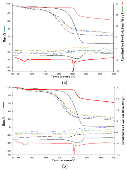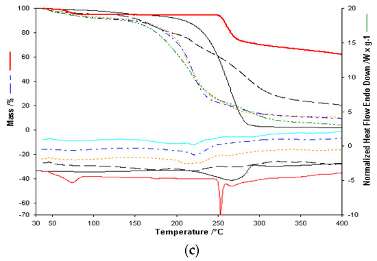 In order to analyze the possible interactions between the membrane and the active substance, the results for both the single active substance and two active substances membranes, in comparison with non-active substances membranes, will be shown in the following (Figure 7). Considering the fact that active substances are present in smaller quantities in active substance membranes, the focus will be on the thermal effects specific to the decomposition stages of active substances and the thermal effects for the membrane decomposition.