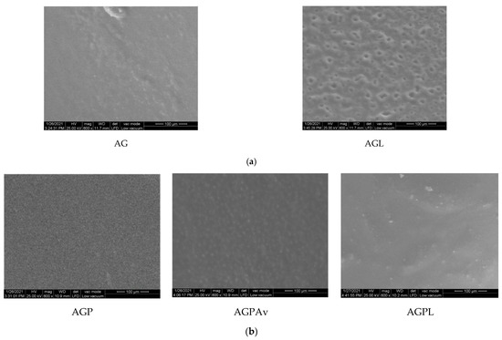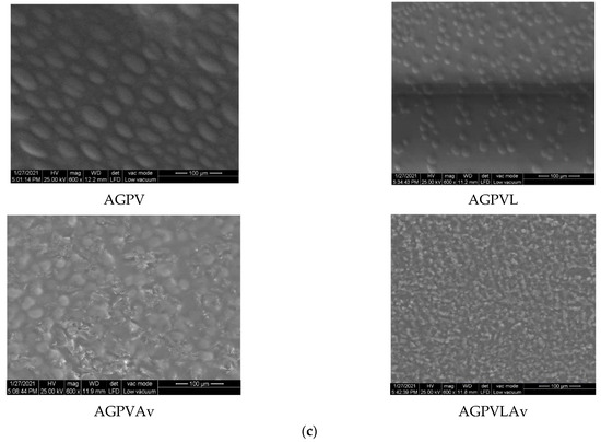 Figure 8a shows that L has a heterogeneous morphological structure, because some larger parts, other smaller, and even some intermediate parts are observed, but the distribution is homogeneous. In the case of AGP membrane (Figure 8b), homogeneous membranes are observed with active substances visible within the membranes. Within the AGPV membrane (Figure 8c), the two basic components of the Alginate membrane and PVA are observed. Moreover, the homogeneous distribution of the active substances within the membranes is observed both in the variant with a single active substance and with both active substances.
