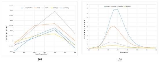 Figure 9a,b show the absorbance obtained in the case of the membranes studied compared to the standard of the active substance. Av and L were visible in all membranes having the maximum absorbance for L at 266 nm and membranes with Av content at 288 nm [38,39]. Following the analysis by UV-Vis spectroscopy, the presence of the active substance in the synthesized membranes is observed in all cases.