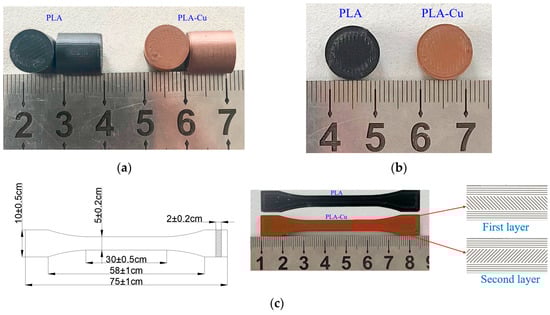 To analyze the influence of copper powder on the mechanical properties and microstructure of PLA-based materials, quasi-static tensile, compression, and SHPB experiments were conducted to elucidate the basic mechanical properties of the materials. Three different specimens were prepared using a 3D printer. The size of the tensile specimen is shown in Figure 1c; the size of the static compression specimen was 10 mm × 10 mm. Based on the stability of the sample and the uniformity of the stress wave passing through the low-wave impedance material, the size of the dynamic impact sample was 12 mm × 4 mm. The sample size and physical maps are shown in Figure 1.