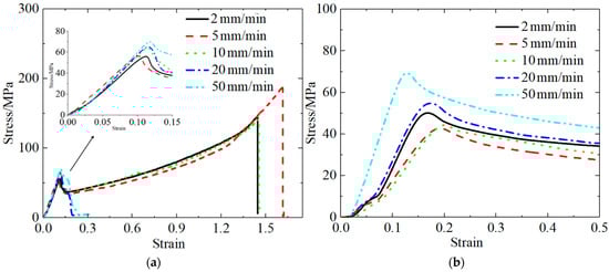 Table 5 and Table 6 present the PLA quasi-static experimental results at different tensile and compression rates. The stress–strain curves for the PLA materials were obtained under the conditions of different tensile and compression rates by processing the experimental data, as shown in Figure 3.
