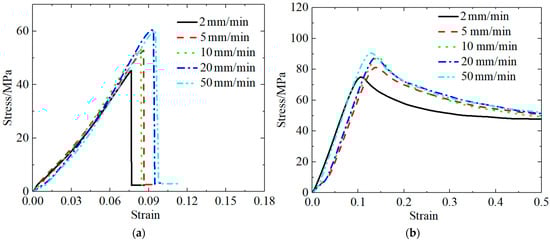 Figure 3 shows the quasi-static stress–strain curves for the PLA material. As can be seen in Figure 3a, the shape of the tensile curve for the PLA material significantly depended on the rate at which tension was applied, implying that the material exhibited the strain rate effect. As the strain rate increased, the strength of the material increased, the toughness and ductility decreased, and the material exhibited characteristics indicative of a change from tough to brittle.