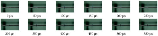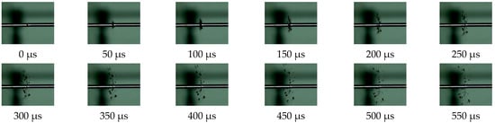 Figure 7 and Figure 8 show the dynamic loading failure processes for the two materials. Under the action of impact loading, the PLA sample did not experience instantaneous damage, as the failure was a dynamic process. Figure 7 shows that the PLA sample was compressed and deformed at 50 μs and exhibited cracks along the edges. Additionally, only a small portion of the material was separated from the sample body and scattered. The inset of Figure 5a demonstrates that at 400 μs the PLA sample was broken down by the incident bar in the center. Damage analysis of the sample revealed that the extent of damage increased as the impact speed increased; the damage was observed as a hole formed in the center of the sample.