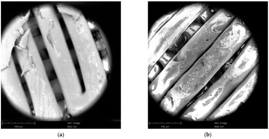 Figure 9 shows the resulting images of the 3D-printed sample. Because the printing parameters and conditions were the same, the printed samples of the two materials had the same structure, i.e., they were stacked layer by layer to form a grid crossing. Although the printing filling density was set to 100%, a gap could be observed between the printed filaments; this was an inherent feature of the 3D-printed samples.