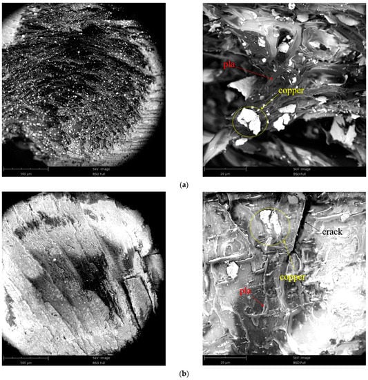 Figure 9c,d are the cross sections of PLA and PLA-Cu tensile specimens, respectively. The comparative analysis shows that the biggest difference between the two is that the PLA tensile specimen had a necking phenomenon, while the PLA-Cu tensile specimen did not. At the same time, it can be seen that there are some defects in the two tensile samples. These defects were arranged in neat rows along the tensile loading direction, which had a slight impact on the tensile results.