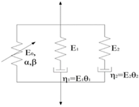 where E0, α, and β are nonlinear elastic constants; E1 and E2 are the linear elastic moduli at low and high strain rates, respectively; and θ1 and θ2 are the relaxation times at low and high strain rates, respectively.