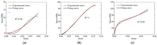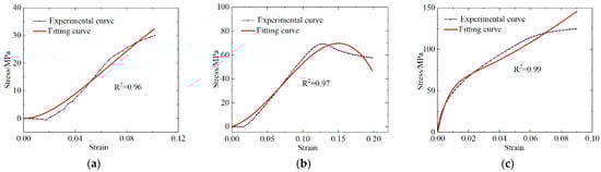 Comparison of PLA-Cu experimental curve and fitting curve. (a) Low strain rate stress difference; (b) low strain rate; (c) high strain rate.