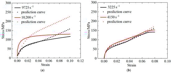 The parameters of the ZWT constitutive model (Table 11) were substituted into Equation (4) to obtain the prediction curve equation for high strain rates. The results of the predicted and experimental curves were subsequently compared, as shown in Figure 14.