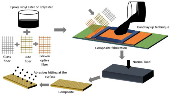 Moreover, increasing the impingement angle and size of erodent particles increased the erosive wear. The incorporation of marble dust in glass fiber reinforced polymer composite reduces erosive wear of the fabricated composite, as marble dust increases the hardness and stiffness of the composite surface [39]. Diversifying the process parameters and input variables such as matrix type, filling material, and manufacturing method can reduce the erosive wear of the manufactured composites. Calcium carbonate (CaCO3), barium sulphate (BaSO4), and tungsten carbide (WC) filled glass fiber reinforced PA/ABS composite prepared by injection molding exhibited relatively lower erosive wear at higher impingement angle, i.e., 90° or 75° [40,41,42]. However, the incorporation of CaCO3 and BaSO4 promoted ductile and semi ductile erosive wear while WC promoted brittle wear of the composite. Treatment of fiber by chemical agents plays a crucial role in enhancing the resistance of composite against erosive wear. Benzoylated treated areca sheath fiber reinforced polyvinyl chloride exhibited lower erosive wear than untreated areca sheath fiber-reinforced composite [43]. In addition, fiber treatment encourages good bonding between fiber and matrix resulted in low erosive wear efficiency. The erosive wear of carbon and glass fibre reinforced composites demonstrated that they could attain excellent erosive wear resistance without using any ceramic filler; however, this was not the case with natural fibre reinforced composites. [44]. It is interesting to observe from the literature that synthetic fiber reinforced composites exhibited lower erosive wear than natural fiber-reinforced polymer composite. Jute fiber has excellent strength, good UV protection, low thermal conduction and attractive anti-static properties which qualifies it a good reinforcing material. In addition, low cost Grewia optiva fiber, low density, easily available in the Himalayan region contains high amount of pectin (jelling and thickening agent) which is advantageous in making good bonding with polymeric chain and can be useful in a way of making cheaper and lighter prosthesis with good mechanical and tribological properties. As discussed in the literature, research on the erosive wear of composites combining both natural and synthetic fibers has been limited. As a result, the current research focuses on the hybridization of synthetic and natural fibres and compares the erosive wear of composites comprising three different resins: epoxy, polyester, and vinyl ester, using the Taguchi methodology as shown in the Figure 1.
