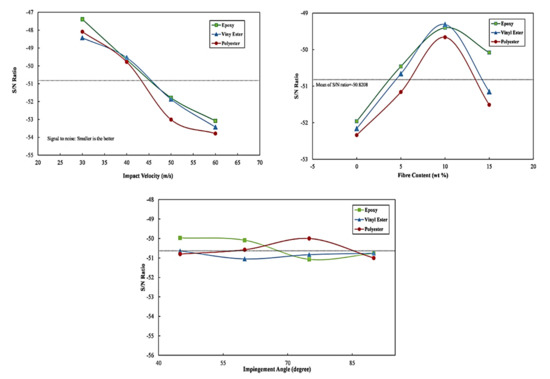 The analysis of results as shown in Figure 6 concludes that the combination at an impact velocity of 30 m/s, fiber content of 10 wt% and impingement angles of 45° yields the lowest erosive wear in epoxy-based composites. For the vinyl ester composites, the lowest wear rate was obtained for the combination at impact velocity of 30 m/s and fiber content of 10 wt% and impingement angles of 45°. Additionally, in the case of polyester-based composite, the lowest erosive wear was obtained at 30 m/s, fiber content of 10 wt% and impingement angles of 45°. Furthermore, as described in Table 7, the order of effectiveness of control factors is impact velocity (1st), fiber content (2nd), and impingement angle (3rd).