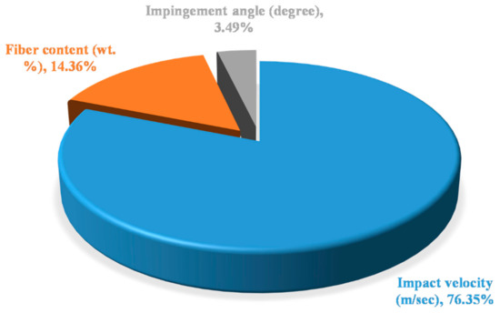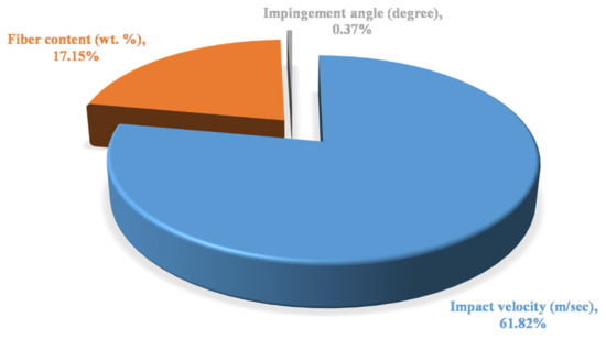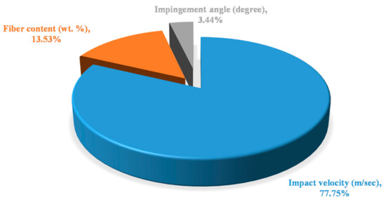 Analysis of variance (ANOVA) was used for the analysis of the statistical significance of control factors at 95% confidence level. The p-value of control factors or epoxy-based composites is shown in Table 8 which shows the degree of significance of the control factor on erosive wear. It was observed that the value of p for impact velocity is 0.001 which is lower than assumed p-value, i.e., 0.05 and is the most significant factor for the analysis of erosive wear. The next significant factor was fiber content with the p-value of 0.046. Impingement angle was observed to be least significant factor as per the ANOVA Table 8. The contribution of all the factors for epoxy-based composites with the highest contribution of impact velocity has a value of 76.35%, followed by fiber content with the contribution factor of 14.36% and the least contribution of impingement angle with 3.49% is shown in Figure 7.