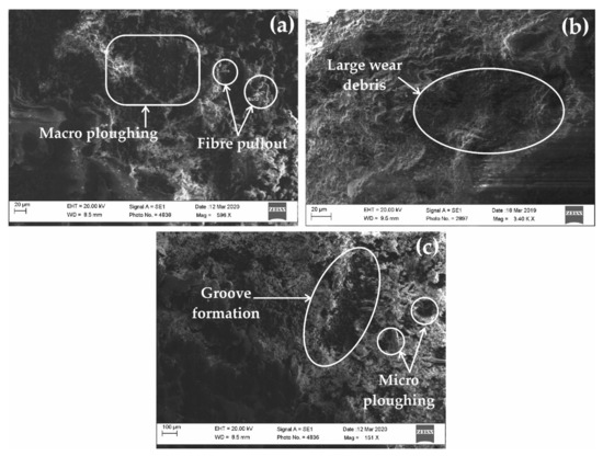 The Figure 10 illustrates the mechanism took place during the wear examination of all three types of composites at highest fiber loading. Epoxy based composites as shown in Figure 10a exhibited fiber pull out leading to exposure of fibers with the wear surface [56,57,58,59,60,61,62]. The patches of ploughing at macro level have also been observed which may be considered as the major factor in the wear of the composite. However, the overall wear of epoxy-based composites reduced by the interaction of fiber with the mating surface took place by fiber pull out. It is to be noted that addition of jute and grewia fibers in the glass fiber-epoxy composites increases the erosive wear till 10 wt% of loading. However, on increasing the natural fiber weightage beyond 10% loading, the erosive wear behaviour reduces significantly. Large wear debris was spotted in vinyl ester-based composites (Figure 10b). These wear debris formed due to the detachment of sub polymeric material from base material due to low van der wall forces. Here, the exposure of fiber is negligible which somehow can be linked to the comparative higher wear than epoxy-based composites. In case of polyester composites (Figure 10c). The bonding between the natural fiber and ester group of vinyl ester and polyester matrix is comparatively low as compared to epoxy-natural fiber bonding which triggered more fiber detachment. Interestingly, at higher natural fiber loading (15 wt% jute and grewia), the improvement in the erosive wear was not significant as obtained in the study. Apparently, the erosive wear examination revealed that main wear mechanism responsible for material removal is groove formation and micro-ploughing [63,64,65]. A close examination also discloses brittle fractures at some parts, which shows that a small amount of impact forces was also acting on the samples.