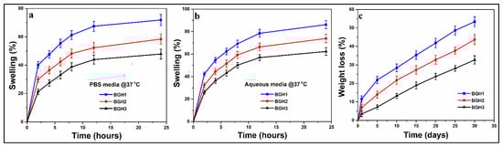 | Samples | Swelling (Aqueous) (%) | Swelling (PBS) (%) | Biodegradation (%) | Wetting 0 s (degree) | Wetting 10 s (degree) |