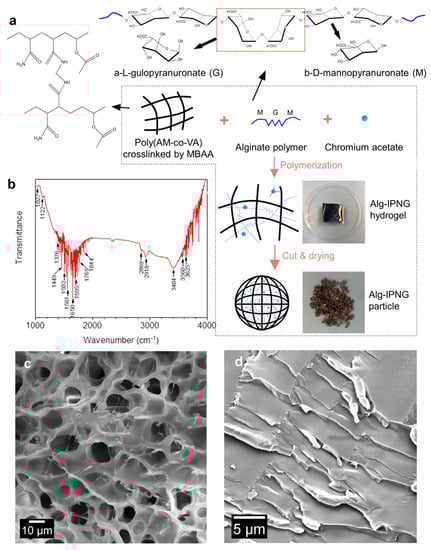 Schematic illustration of the preparation and the interpenetrating structure of the Alg−IPNG particle: (a) preparation; (b) FTIR detection result of the Alg−IPNG particles; (c,d) Microstructures of Alg-IPNG hydrogel and particle.