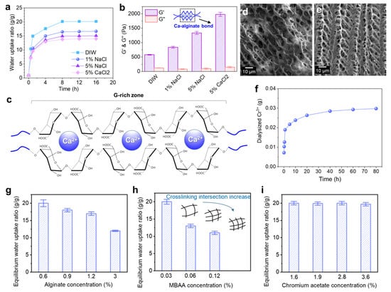 Water uptake and ionic exchange of the Alg-IPNG gels: (a) water uptake kinetic curves of the Alg-IPNG particles in different types of brines; (b) elastic modulus (G’) and loss modulus (G”) of the equilibrium swollen Alg-IPNG particles; (c) structure of the Ca–alginate bond; (d,e) micro-structures of the swollen Alg-IPNG particles immersed in 5% NaCl and 5% CaCl2. respectively. (f) The amount of dialyzed Cr3+ as a function of time; The effect of (g) alginate, (h) MBAA, and (i) chromium acetate on the swelling profile of the Alg-IPNG particles in 0.1% CaCl2.