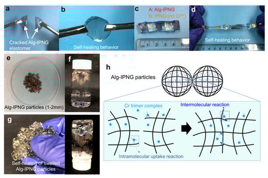 Self-healing of the Alg-IPNG gel: (a,b) self-healing of a broken Alg-IPNG gel; (c,d) self-healing between Alg-IPNG and IPNG gels; (e–g) photograph of the Alg-IPNG particles; (h) schematic illustration of the self-healing process of the Alg-IPNG gel—delayed self-healing by chromium trimer complexes at the contact interfaces of the gel.