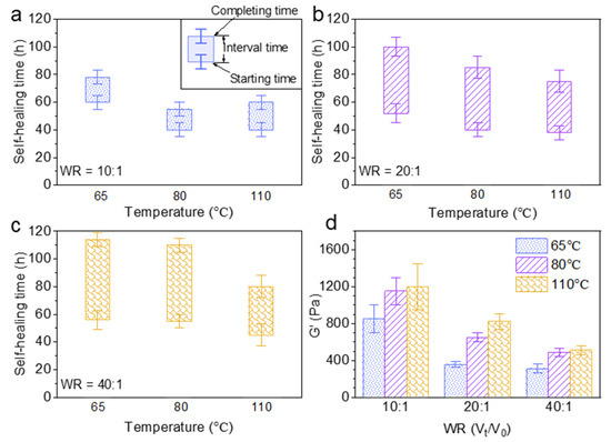 The effect of the water uptake ratio (Vt/V0) and temperature on the self-healing time and rheological property of Alg-IPNG particles was investigated. The brine amount was controlled to render the Alg-IPNG particles half-swollen (10:1), fully swollen (20:1), and fully swollen with excess brine (40:1). Figure 4a showed that the starting time of the Alg-IPNG gels was decreased from 60 to 40 h with the increase in the temperature from 65 °C to 110 °C. For the samples at higher water uptake ratios, the starting time was reduced further with the increase in temperatures (from 52 to 38 at 80 °C and from 71 to 45 at 110 °C; Figure 4b,c). On the other hand, the water uptake ratio of the Alg-IPNG particles had a strong effect on the self-healing interval time, compared with the temperature. For example, the interval time increased from 18 to 49 h when the water uptake ratio increased from 10:1 to 40:1 at 65 °C. The increase in the interval time showed similar trends at 80 °C and 110 °C. Additionally, the interval time reduction trend was not linear as the temperature increased. Figure 4d illustrates the effect of the water uptake ratio and temperature on the G’ of the self-healed Alg-IPNG gel. For example, the G’ with the water uptake ratio at 10:1 was nearly two times that with the water uptake ratio at 20:1 or 40:1. The G’ increased with temperature. For example, as the temperature increased from 65 °C to 110 °C at the water uptake ratio at 10:1, the G’ increased from 850 to 1210 Pa. Interestingly, this result was opposite to the other previously performed particle gel experiments reported by us [7,34] or other researchers who showed relatively capable materials as the temperature increased to a high level, such as 110 °C.