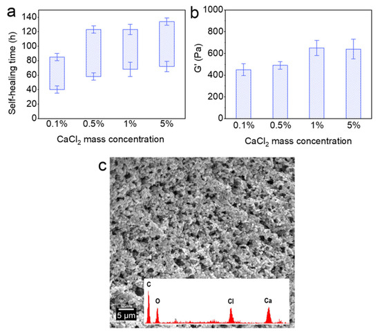 Self-healing of the Alg-IPNG gels at 65 °C: (a) self-healing time; (b) elastic modulus (G’) of the healed gel; and (c) micro-structure of the healed gel.