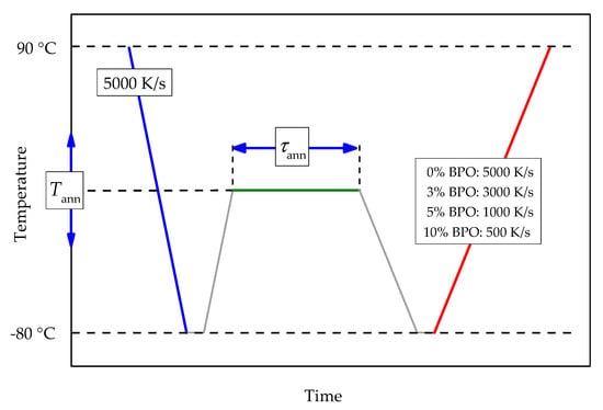 Tammann’s two-stage nucleation and growth approach, with a non-isothermal growth stage [12,22,23], was employed to investigate the kinetics of crystal nucleation and crystallization of neat and cross-linked PCL. The temperature program includes melting with consecutive fast cooling to an annealing temperature, allowing crystal nucleation and, in some cases, also crystallization. The chosen cooling rate prevents the formation of crystal nuclei before reaching the annealing temperature. The duration and the temperature of the annealing step are varied. After annealing, the sample is cooled at 5000 K/s to −80 °C and then heated to 90 °C (analysis scan). See Figure 1 for details of the temperature program.