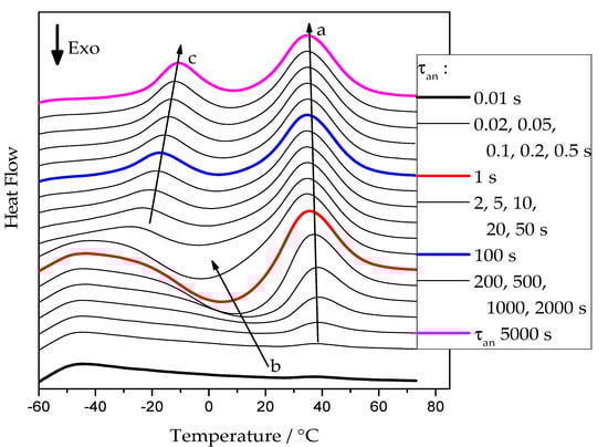 It can be seen from Figure 2 that, with a longer annealing time, an endothermal peak appears between −30 and 0 °C, indicated by the arrow c. This peak corresponds to the melting of tiny polymer crystals which have grown during the extended annealing. However, the peak may not represent the entire melting endotherm, as the developed melt immediately re-crystallizes to form more stable crystals. The latter effect is exothermal and, thus, partially compensates for the low-temperature melting effect. The re-crystallized crystals finally melt during the high-temperature endotherm. This is illustrated in Figure 3b; the red curve represents the low-temperature melting of the tiny polymer crystals, the blue curve represents the exotherm of recrystallization or cold-crystallization, and the magenta curve corresponds to the melting endotherm of the re-crystallized polymer. The black curve corresponds to the overall effect, which is the sum of the heat flows of the individual processes. The shaded area corresponds to the overall latent heat, which is not affected by the melting-recrystallization process since only the sum of the different heat flows is measured.
