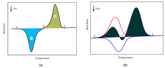 Schematics of (a) Determination of the cold-crystallization enthalpy (area of the peak 1) and overall latent heat (sum of the areas of peaks 1 and 2). (b) Determination of the overall latent heat (shaded area), red curve: melting of tiny polymer crystals, blue curve: recrystallization effect, magenta curve: melting of the re-crystallized polymer crystals.