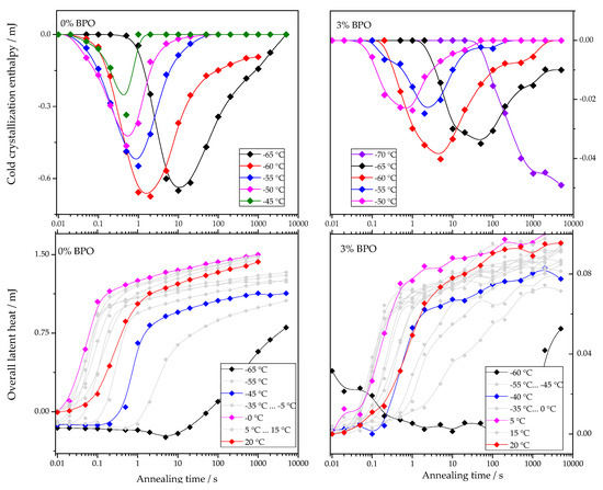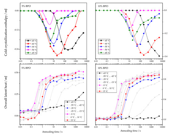 The dependencies of cold-crystallization enthalpy and overall latent heat on annealing time for different annealing temperatures are shown for all studied PCL samples in Figure 4.
