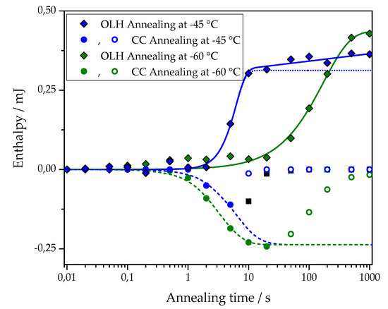 Approximation of the dependence of overall latent heat data (OLH, diamond) on the annealing time with Equation (1) (solid lines). Data for cross-linked PCL with 5% BPO and annealing at −45 °C (blue symbols) and at −60 °C (olive symbols). The dotted line shows the primary crystallization curve, plotted using Avrami equations based on the fit parameters determined for data points obtained after annealing at −45 °C. Approximation of the cold crystallization enthalpy (CC, circles) on the annealing time with Equation (2) (dashed lines). Data for PCL with 5% BPO after annealing at −45 °C (blue symbols) and −60 °C (olive symbols). The fit was performed over the solid points; the hollow points were discarded.